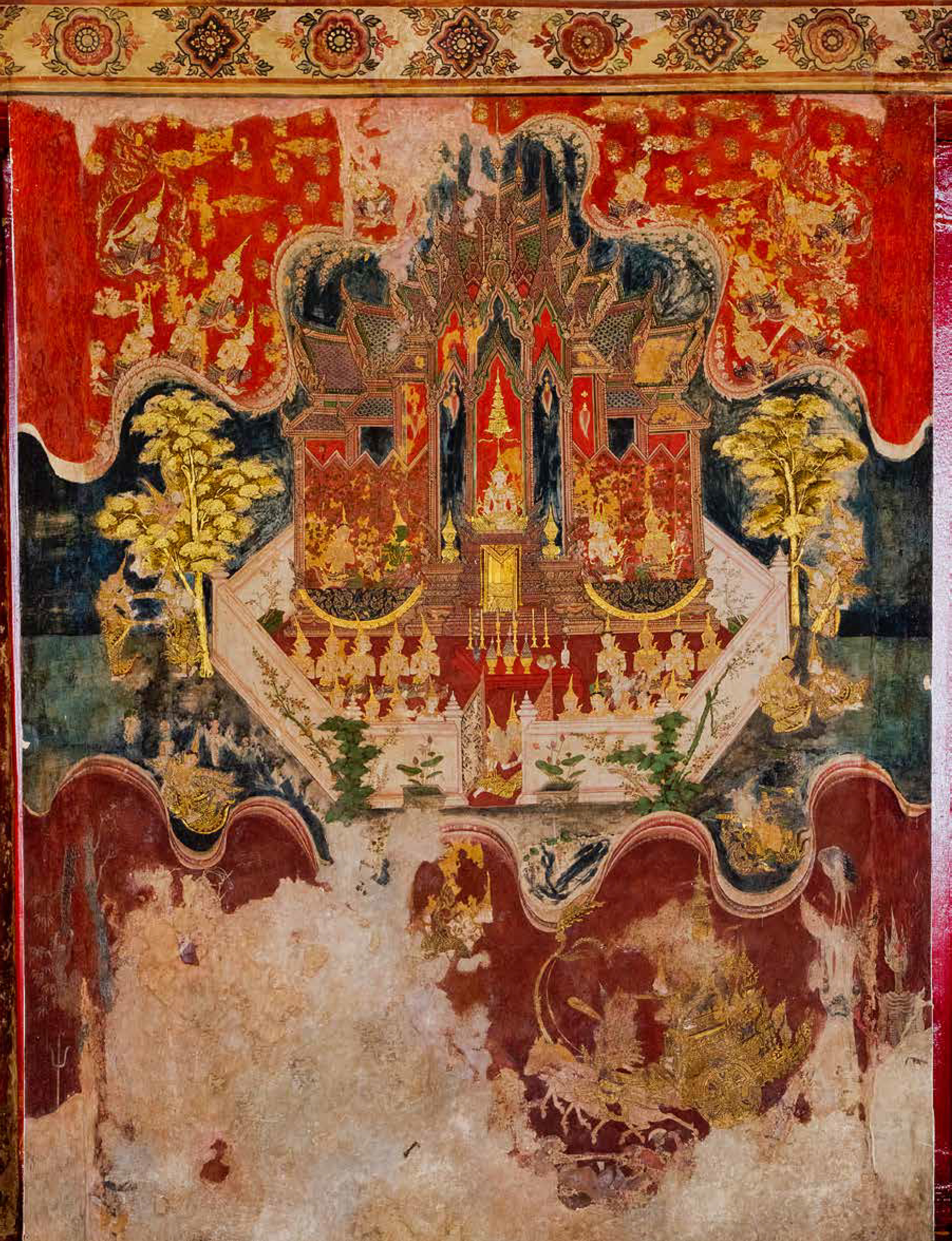 ดังนั้น ด้านล่างของภาพจะเป็นตอนนั่งราชรถชมนรก ซึ่งบัดนี้นรกเลือนหาย หมดแล้ว เหลือแต่หัวเปรตโผล่ขึ้นมาตนหนึ่ง และราชรถก็หลุดลอกไป บางส่วน ราชรถนี้อาจารย์ประยูร อุลุชาฎะ หรือ น.ณ ปากน้ำ ชมว่า “ราชรถเทียมม้าคู่นี้สวยเป็นเยี่ยม” ส่วนบนของภาพเป็นเทวดาที่เหาะ มาเฝ้าเนมิราช แบ่งภาพด้วยลายฮ่อ เป็นริ้วอ่อนช้อยแบบจีน แทนการ แบ่งด้วยเส้นสินเทาหยักฟันปลาแบบไทย สมเด็จฯ เจ้าฟ้าครูช่าง (สมเด็จฯ เจ้าฟ้ากรมพระยานริศรานุวัดติวงศ์) ทรงชมว่า “เขียนลายกนกได้ล้ำาเลิศ ทั้งละเอียด และประณีต” การเขียนหน้าพระ เทวดานางฟ้านั้นสวยงามไม่แข็งเหมือนใส่หน้ากาก ท่วงท่ามือไม้นิ้วอ่อนช้อยสวยงาม