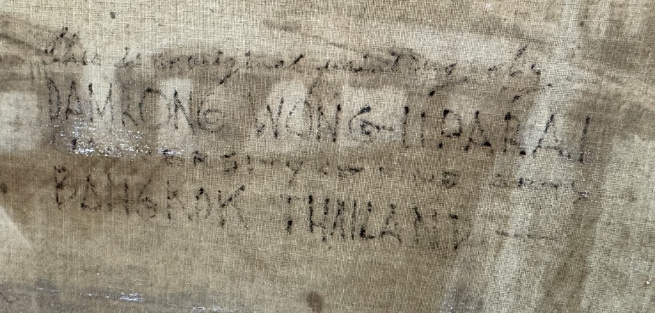 – ดำรงเขียนเล่าไว้ในบทความตอนที่ท่านอาสาซ่อมภาพ ‘หมู่บ้านชาวประมง’ ในห้องศาสตราจารย์ศิลปเอาไว้ว่า ภาพนี้ซึ่งสภาพเดิมเป็นผ้าดิบที่ถูกขึงไว้บนเฟรม แต่เมื่อท่านเห็นผลงานชิ้นนี้อีกครั้ง ภาพก็ถูกอนุรักษ์โดยการรีดติดไว้บนกระดานไม้อัดเทียมแล้ว ซึ่งท่านเองก็ไม่ค่อยพอใจเท่าไหร่เพราะมีกรด และความชื้นจากเนื้อไม้แทรกออกมาบนภาพทำให้สีในภาพหมองลง และบางส่วนเปลี่ยนไปเป็นสีน้ำตาล หากสภาพผลงานเป็นอย่างที่ดำรงให้ข้อมูล นั่นหมายความว่าถ้าพลิกดูด้านหลัง ปัจจุบันเราจะไม่สามารถมองเห็นพื้นหลังผ้าดิบผืนเดิมได้ แต่จะเห็นด้านหลังกระดานไม้อัดที่นำมาปิดไว้แทน จึงทำให้ไม่รู้ว่าแต่เดิมมีข้อมูลอะไรเขียนเอาไว้ด้านหลังภาพหรือเปล่า ต่างกับภาพ ‘บ้านชาวประมง’ ซึ่งผ้าดิบและเฟรมยังอยู่ในสภาพดั้งเดิม ไม่ถูกดัดแปลงไปติดไว้บนกระดานไม้ จึงยังสามารถเห็นข้อความที่ถูกเขียนไว้ด้านหลังภาพว่า