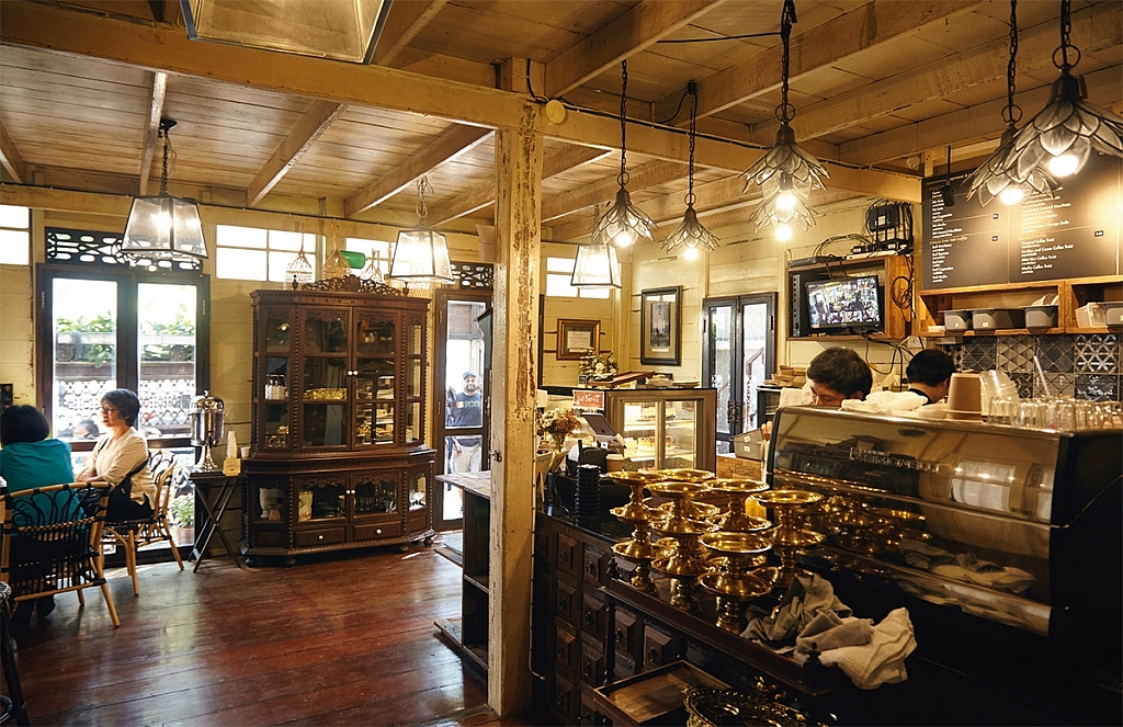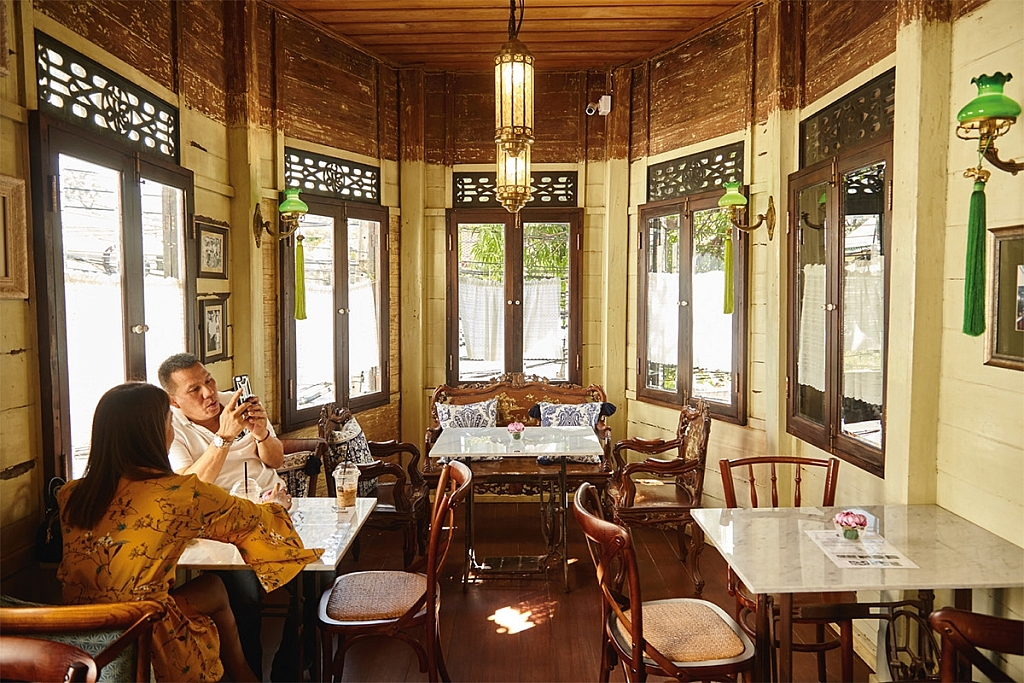 และวันนี้ไม่ว่าใครก็เข้ามาชมเรือนไม้เก่าหลังนี้ได้ เพราะตอนนี้เปิดเป็นร้านกาแฟ ส่วนขนมก็มีขนมตระกูลทองที่ใส่ภาชนะทองมาอย่างสวยงาม เฉาก๊วยที่มีไอศกรีมใบเตยรองอยู่ในถ้วยและตกแต่งด้วยฝอยทอง เสิร์ฟเป็นชุดพร้อมน้ำชา และยังมีเค้กอีกหลายชนิดเรียกว่ามีทั้งความเป็นไทยและความร่วมสมัยที่ทุกคนมาสัมผัสได้ในบรรยากาศเรือนไทยโบราณที่ยังคงสวยงามน่ามอง