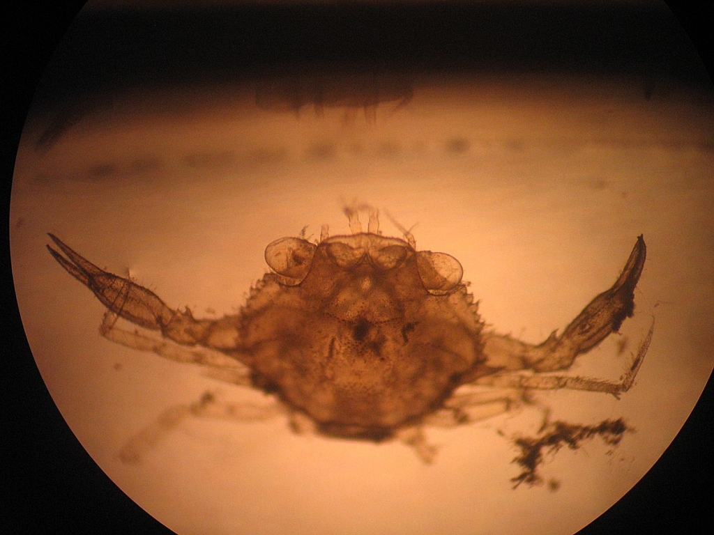 “นี่คือไข่นอกกระดอง มันจะมีเรื่องพัฒนาการโดยการเปลี่ยนสีของไข่ใช้เวลา ๕ ถึง ๗ วัน จาก เหลือง ส้ม เทา ดำ ซึ่งสีดำคือพร้อมที่จะวางไข่แล้ว ปูตัวผู้เวลาผสมพันธุ์น่ะจะฝังน้ำเชื้อไว้ที่ตัวเมีย เป็นการกระตุ้นให้ตัวเมียสร้างไข่ขึ้นมา ไข่จะพัฒนาเป็นระยะที่ ๑ ๒ ๓ ๔ พอระยะที่ ๔ เตรียมพร้อมปล่อยออกมา ก็จะฉีดน้ำเชื้อที่ตัวผู้ได้ฝากเอาไว้มาผสมแล้วปล่อยลงไปบนพื้นทราย”
