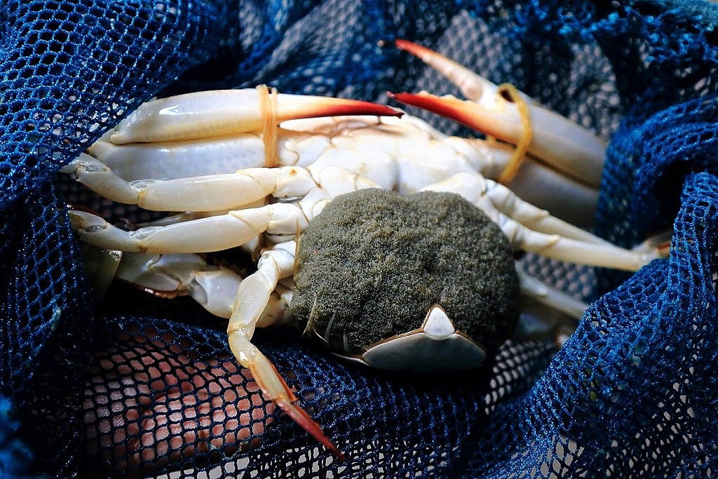 นักวิจัยปูใช้สวิงช้อนเอาปูไข่นอกกระดองจาก “บ่อเพาะฟัก” ขึ้นมาให้ดูเป็นตัวอย่าง