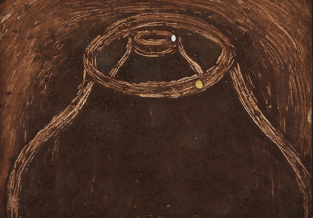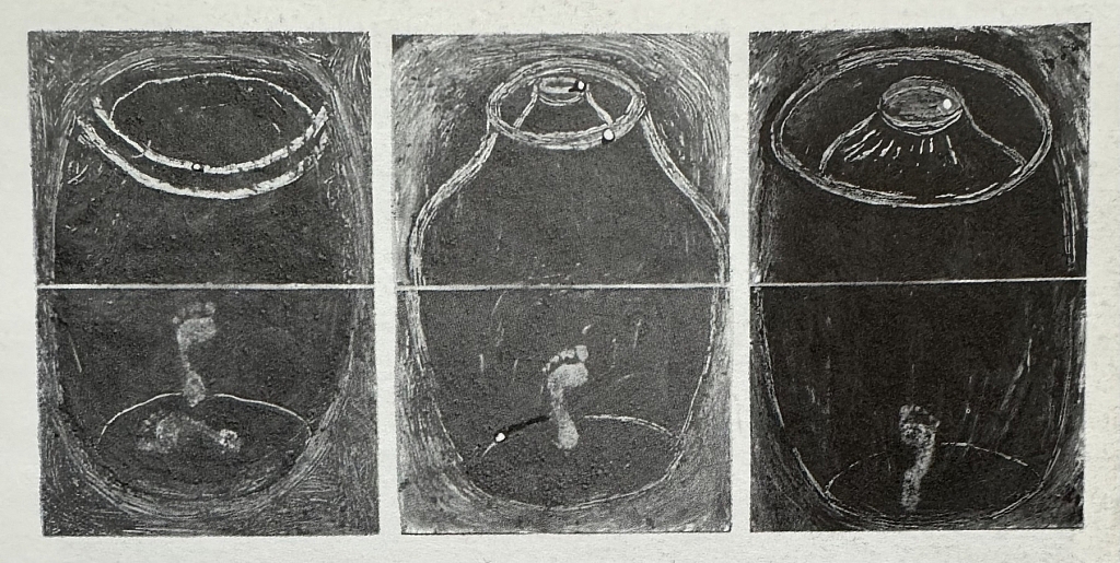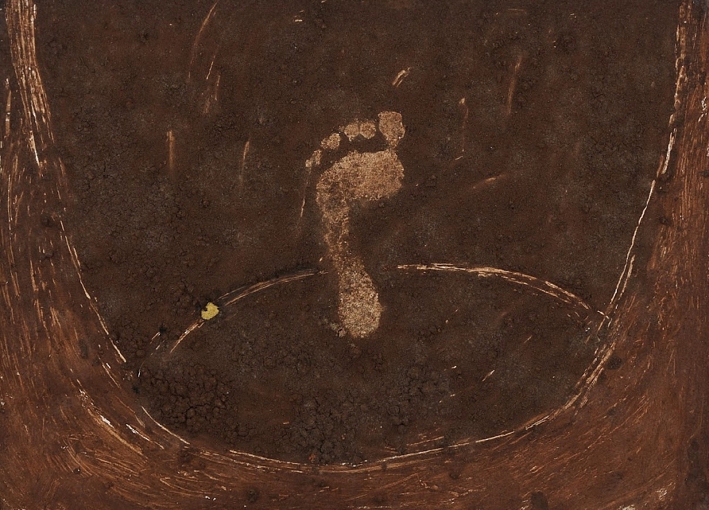 รอยเท้าในพื้นที่ว่างใจกลางโอ่งจึงน่าจะสื่อถึงตัวตนของมณเฑียรผู้มองหาที่หลบให้จิตสงบ ในห้วงเวลาขณะโรคร้ายกำลังย่างกรายไปสู่คนใกล้ชิด
