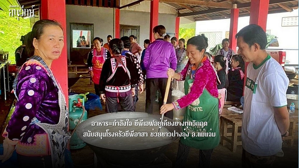 ที่โรงครัวกลางบ้านปางอุ๋งโรง วัดนักบุญยวงบัปติสตา หรือโบสถ์ปางอุ๋ง ซึ่งเป็นโรงครัวจิตอาสาเริ่มเดินเครื่องตั้งแต่วันแรก ขณะเดียวกัน ซีพีเอฟได้จัดเตรียมวัตถุดิบอาหารคุณภาพ ทั้งหมูบด ไก่สับ ไข่ไก่สด และน้ำดื่ม ส่งตรงถึงทีมครัว พร้อมทั้งระดมจิตอาสาซีพี-ซีพีเอฟจากหลายหน่วย ทั้งมูลนิธิกระจกเงา มูลนิธิปริสุทโธ และชาวชุมชน ที่เข้าร่วมมาช่วยกันปรุงอาหารแจกจ่ายผู้ประสบภัยทั้งจากมูลนิธิกระจกเงา