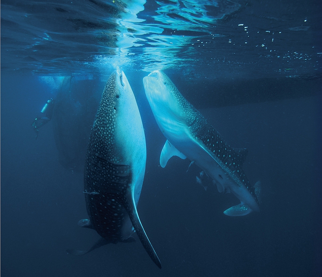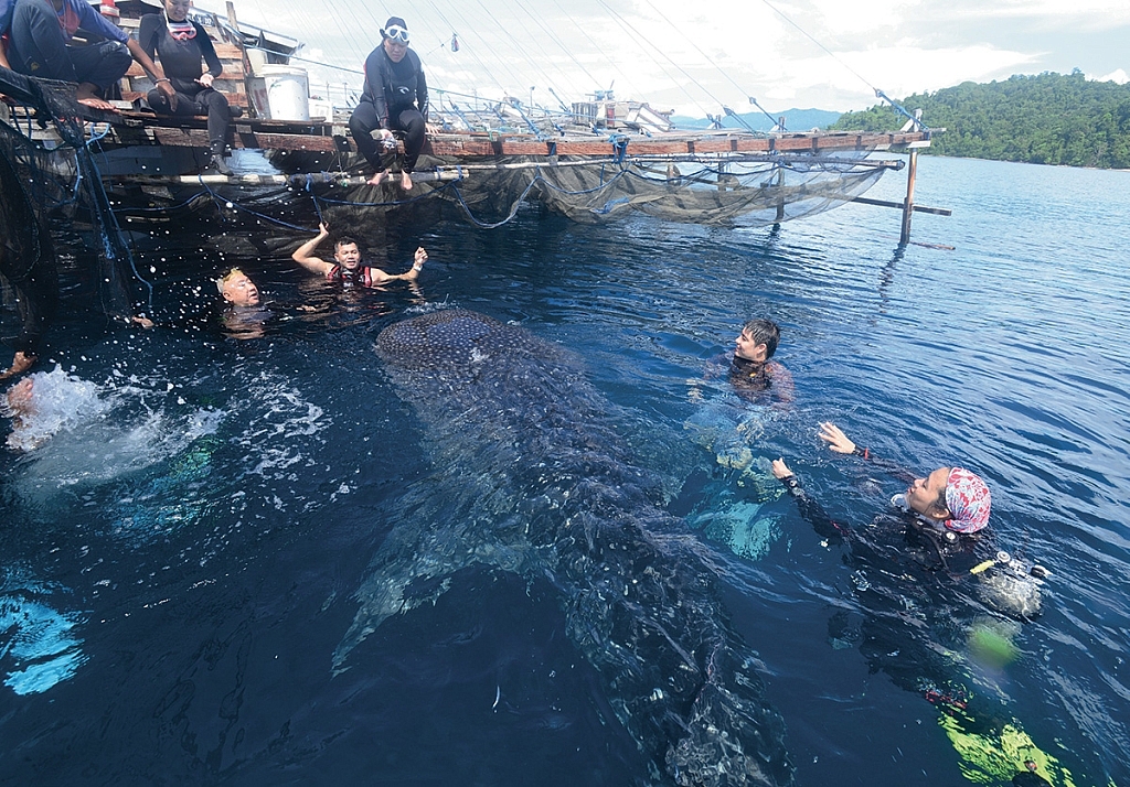 เรื่องราวความสัมพันธ์ระหว่างปลากับคน เลี้ยงปลาในกระชังที่เมืองนี้แพร่กระจายไปทั่ว ทุกมุมโลก แล้วใครๆ (รวมทั้ง UNESCO) ก็ พยายามขวนขวายข้ามน้ําข้ามทะเลมาดู รวม ทั้งผม ซึ่งไปดูเขาอ้อนกันอย่างนี้ ๕ วันเต็ม โดยเรือภาณุนี้จะไปทอดสมออยู่ไม่ไกลจาก กระชังปลา แล้วก็ส่งนักดําน้ําลงไปดําผุดดํา ว่ายไปถ่ายรูปกับฉลามวาฬหลายต่อหลายตัว อยู่กันอย่างนี้ตั้งแต่พระอาทิตย์ขึ้นไปจนค่ำมืดดึกดื่น แล้วพอรู้จักกันมากขึ้น คุ้นเคยกันมาก ขึ้น เราก็พอจะมีคําตอบให้กับตัวเองว่า ฉลาม วาฬเป็นสัตว์ขี้เล่น เดาใจยาก บางครั้งเขาก็ ตื่นกลัวและไม่อยากให้ใครเข้าใกล้ แต่ถ้าอยู่ ในอารมณ์ที่เขาอยากสนุกด้วยแล้วละก็ จะ เข้ามาหาและพันพัวอยู่กับเราไม่ยอมห่างเลย ทีเดียว เพราะบางเวลา พ่อฉลามวาฬก็ว่ายน้ํา คลอๆ มากับพวกเราตอนว่ายน้ํากลับเรือ แล้ว ก็เพลิดเพลินเล่นอยู่กับเราอีกนานนับชั่วโมง
