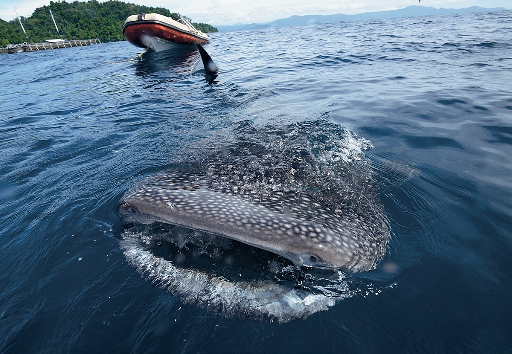 แต่ใครจะคิดว่า พอเช้าๆ จะมีปลาตัวใหญ่ เข้ามาด้อมๆ มองๆ ขอปลากิน ชาวประมง ปาปวน คนใจใหญ่ ปลาของตัวยังไม่ทันได้ทํา เป็นปลาเค็มเลย ก็กระวีกระวาดเอากระชอนด้ามยาวตักปลาจากในกระชังป้อนใส่ปากคุณ ปลาใหญ่เสียก่อน แต่ป้อนเท่าไรก็คงไม่พออิ่มเพราะปลาที่เข้ามาไม่ได้เป็นปลาสวายอย่างเขตอภัยทานบ้านเรา แต่เป็นปลาฉลามวาฬตัวเท่ารถตู้ เข้ามาทีละ ๕-๖ ตัว บางวันชาว ประมงได้ปลาน้อยไม่พอแบ่งให้ พ่อฉลามวาฬขัดใจ ไม่ป้อนให้ก็ดูดเอาจากถุงตาข่ายเหมือน เด็กดูดนมจากขวด